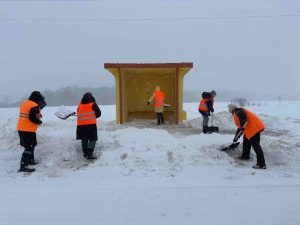 Так, работники ДРСУ-198, включая специалистов ИТР, вели работы по очистке остановочных пунктов в сельской местности.